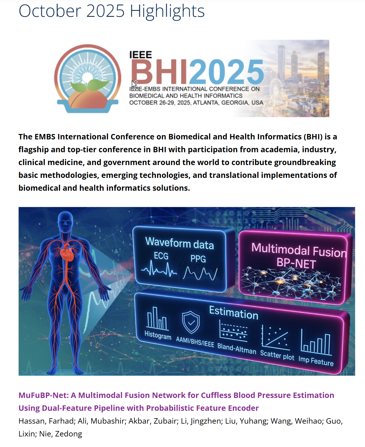 2025年10月,中国科学院深圳先进技术研究院(简称“深圳先进院”)聂泽东研究员团队在 IEEE Journal of Biomedical and Health Informatics(JBHI)发表了基于ECG与PPG的动态血压监测研究 “MuFuBP-Net: A Multimodal Fusion Network for Cuffless Blood Pressure Estimation Using Dual-Feature Pipeline With Probabilistic Feature Encoder”(Highlights文章),并以配图形式登载于 JBHI October 2025当期封面。