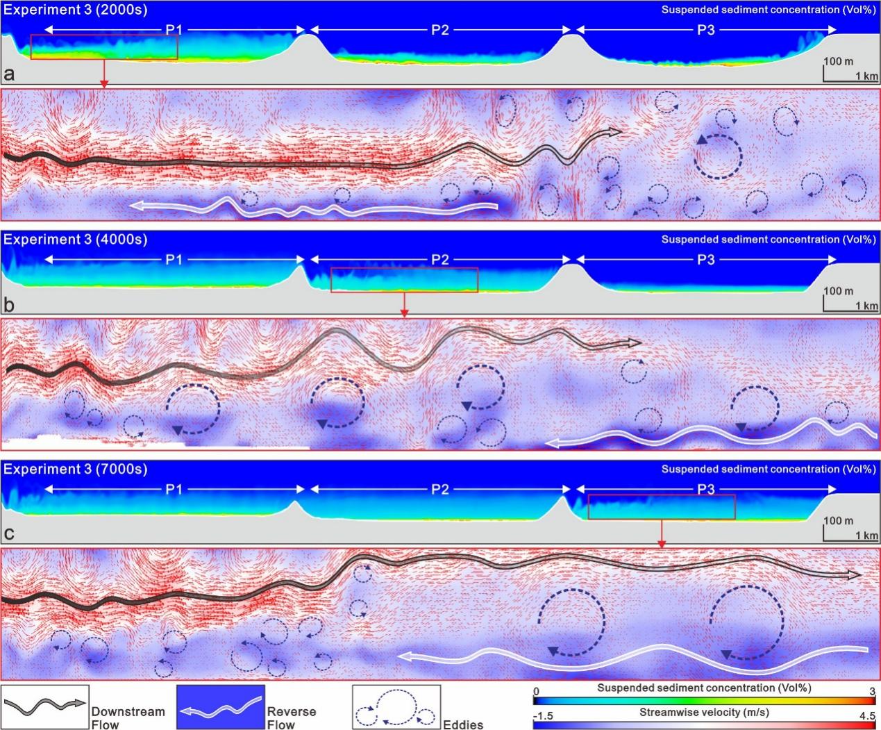 研究结果显示,当浊流流经链状分布的麻坑群时,会与地形发生复杂的动力耦合:麻坑上游侧壁受强侵蚀作用,下游侧壁形成反向回流。这种“正向流—反向流”的耦合机制使得麻坑底部逐渐被沉积物填平,相邻麻坑间的边界被浊流侵蚀贯通,最终演化形成新生海底水道(图2)。