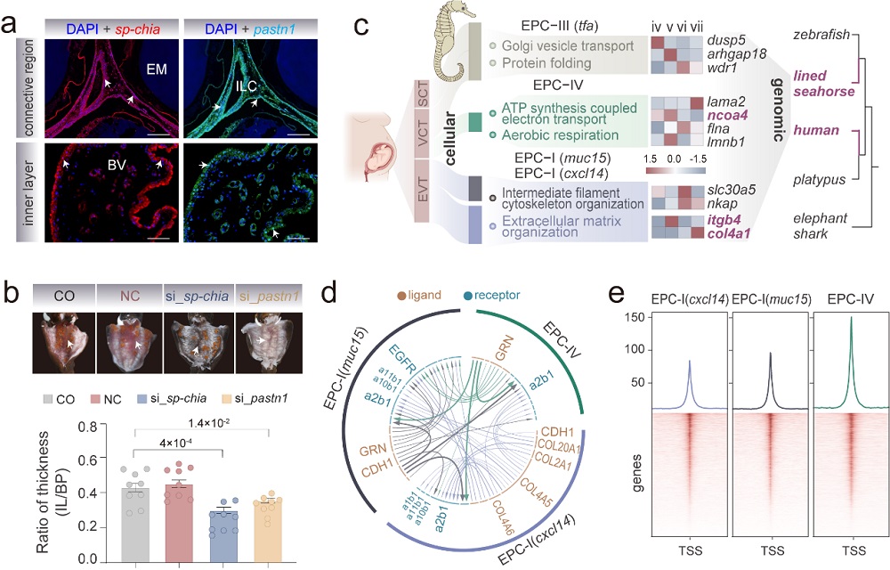 为了深入探究海龙科物种育儿袋发生及其怀孕过程的遗传与细胞学调控机制,研究团队以海马和海龙为研究材料,通过整合单细胞RNA测序(scRNA-seq)、单细胞染色质可及性测序(scATAC-seq)及空间转录组等多组学手段,绘制了海马育儿袋7个发育时期的细胞学动态变化图谱,发现了一类具有干细胞潜能的“育儿袋上皮祖细胞(BEPCs)”。这些细胞在发育过程中与胶原蛋白基因协同表达,并受雄激素信号强烈调控。同步,该研究通过动态网络生物标志物分析及在体实验,证实雄激素处理的雌性海马可发育出雄性特有的育儿袋。据此,本研究首次提出了雄激素受体及其调控的育儿袋上皮祖细胞是激活育儿袋器官形成的关键开关(图2)。
