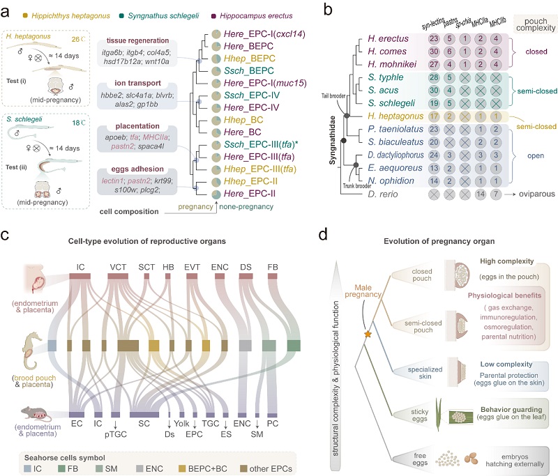 在生命起源与多样性演化历程中,繁育后代在传统上一直被定义为雌性个体的生命本职。然而,海龙科物种(Syngnathidae)却打破了这一生物演化的常规,成为脊椎动物中唯一具有“雄性怀孕”繁殖策略的类群;其雄性个体通过特有的育儿袋(brood pouch)器官为胚胎提供氧气和营养输送、免疫防护及渗透压调节等功能(Lin et al.,Nature,2016)(图1)。同时,研究团队前期研究表明海龙科育儿袋在结构与功能上与哺乳动物子宫表现出明显的趋同进化特征(Zhang et al.,National Science Review,2021;Liu et al.,Nature Communications,2022);且海龙科物种的育儿袋在进化过程中出现了多种形式,如开放、半开放和封闭等模式(Qu et al.,Science Advances,2021)。然而,该类群作为自然界独一无二的“孕父”,其以何种方式在截然不同的生命演化谱系中“重现”了胎盘功能?而脊椎动物由“卵生”到“胎生”的自然选择规律如何?又是何种分子信号主导了这场独特的繁殖演化进程?这一系列疑问一直是长期以来学界关注的焦点问题。
