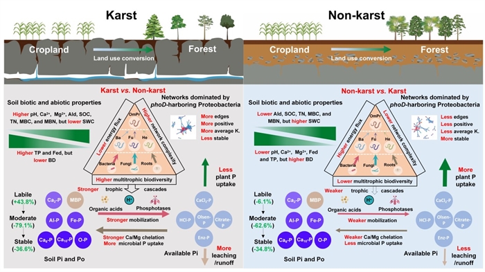 研究发现,无论是喀斯特农田还是非喀斯特农田,长期施肥增加了土壤中等活性和稳定磷组分的积累,削弱了生物磷活化能力。耕地转变为森林后,喀斯特土壤活性磷组分增加了43.8%,中等活性磷和稳定磷组分分别减少了79.1%和36.6%,而非喀斯特土壤中等活性磷和稳定磷组分分别减少了62.6%和34.8%。喀斯特区多营养级生物多样性和磷活化能力高于非喀斯特区。温度升高会增强多营养级生物对森林土壤磷活化能力的正向级联调控。喀斯特森林恢复重建通过增强解磷细菌-菌根植物-线虫的级联关系,促进了土壤磷生物活化-吸收的协同提升,降低了高钙/镁环境下的磷沉淀固定作用,从而缓解了磷限制。然而,喀斯特生态系统脆弱,人为干扰(如耕作和毁林)极易造成物种丧失并削弱多营养级生物间相互依存的关系。同时,农田磷素管理应减少磷肥投入,增强土壤残留磷的生物活化,遵循“促活化,增吸收”的绿色可持续发展理念。该成果对缓解喀斯特生态系统磷限制、促进植被可持续恢复具有重要参考价值。