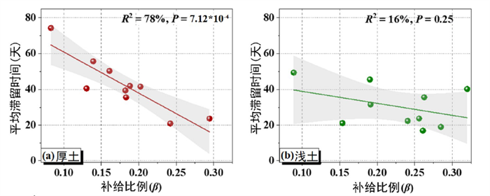 中国科学院亚热带农业生态研究所陈洪松研究员团队在广西环江通过水稳定同位素示踪技术,揭示了坡地土壤厚度对入渗和径流水补给特征的影响机制。该研究选取两处土壤厚度差异显著的山坡,通过长期原位监测获取土壤水和径流样本,并测定其氢氧稳定同位素组成。基于分段同位素平衡模型,量化了降雨对可移动水的补给比例、平均滞留时间及干旱期径流的蒸发损失比例。结果表明,渗透性更高的浅土山坡具有快速的水分补给特征,表现为更高的雨水补给和水分蒸发损失比例及更短的水分滞留时间(图1)。厚土山坡补给比例和滞留时间具有极显著的相关性(R2=0.78),而浅土山坡这种快速且复杂的水文特征导致其通过水文参数预测过程的难度更高(图2)。因此,即便是在小流域范围,在水资源优化配置方面也需要考虑进行差异性的管理,而土壤厚度理论上是一个重要的参考指标。