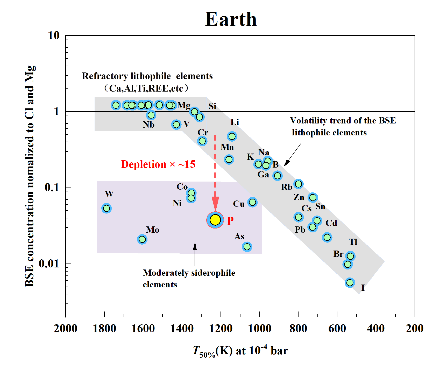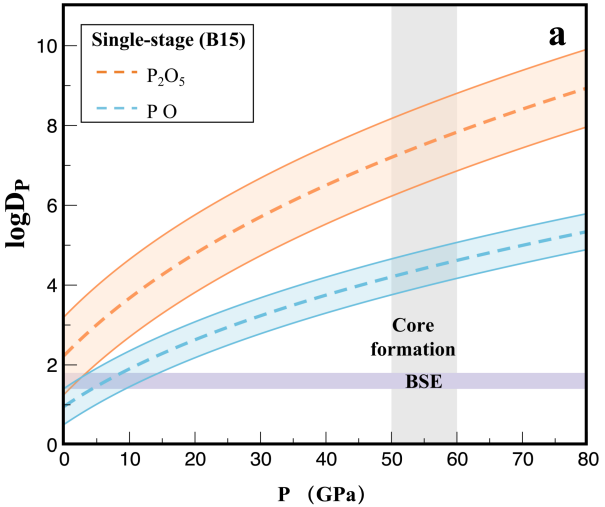 磷是DNA与RNA的必需组分,其地球化学行为对行星分异和生命演化研究具有重要指示意义。作为典型的中等亲铁元素,磷的金属/硅酸盐分配系数对压力(P)和温度(T)极为敏感,是限定早期岩浆洋热力学条件的关键参数。现有研究表明:硅酸盐地球(BSE)的磷丰度出现明显亏损(图1),其亏损机制被认为与核幔分异有关,即在核幔分异过程中,磷在高压下的亲铁性导致大量的磷进入地核。然而,在核幔分异所对应的高压条件下,磷的分配行为至今仍未厘清。并且现有低压(<20 GPa)实验数据显示,磷的拟合结果呈现多种价态。这种价态分歧外推至高压区间,显著放大了分配系数的不确定性。