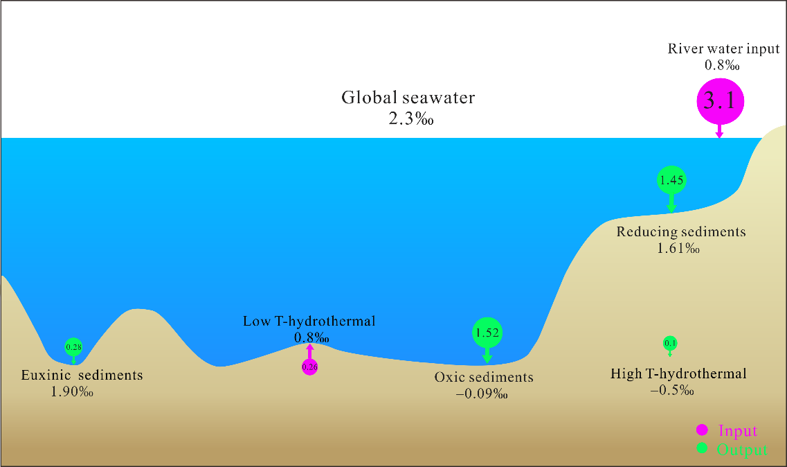 图 4. 海洋钼(Mo)同位素质量平衡的最新模型。该示意图展示了全球Mo收支平衡中的主要输入项(紫色圆圈:河流输入、低温热液输入)与输出项(绿色圆圈:各类沉积物、高温热液输出)。每个圆圈的大小与估算通量成正比,通量数值标注于圆圈内(单位:×10⁸ mol / 年,黑色字体)。本模型的概念框架基于 Little 等人(2025 年)的研究成果。