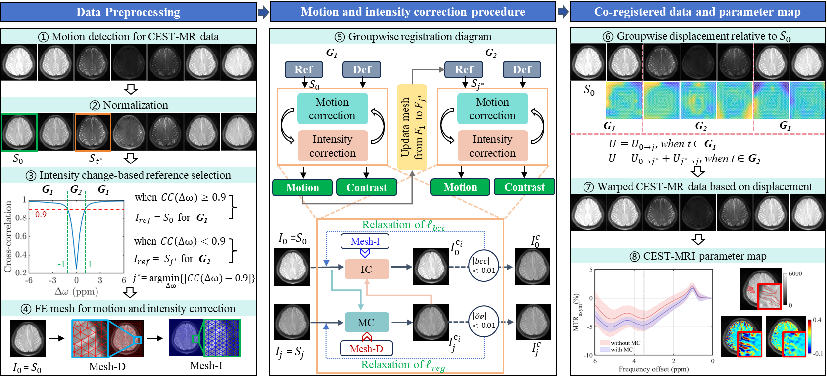 研究团队在有限元数字图像相关(FE-DIC)基础上,构建了面向 CEST-MRI 的交替式运动-强度联合校正框架(图1)。一方面,通过力学正则化在有限元网格上估计时空连续、组织一致的位移场;另一方面,在每轮运动校正后自适应更新全局亮度和对比度,以补偿频率依赖性的强度变化。二者以迭代交替的方式紧密耦合,使运动估计不再受强度变化干扰、强度校正也不再受到残余运动限制,从而实现了对 CEST-MRI 动态序列的协同优化配准。