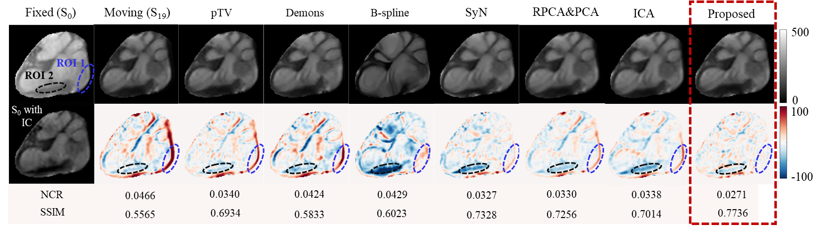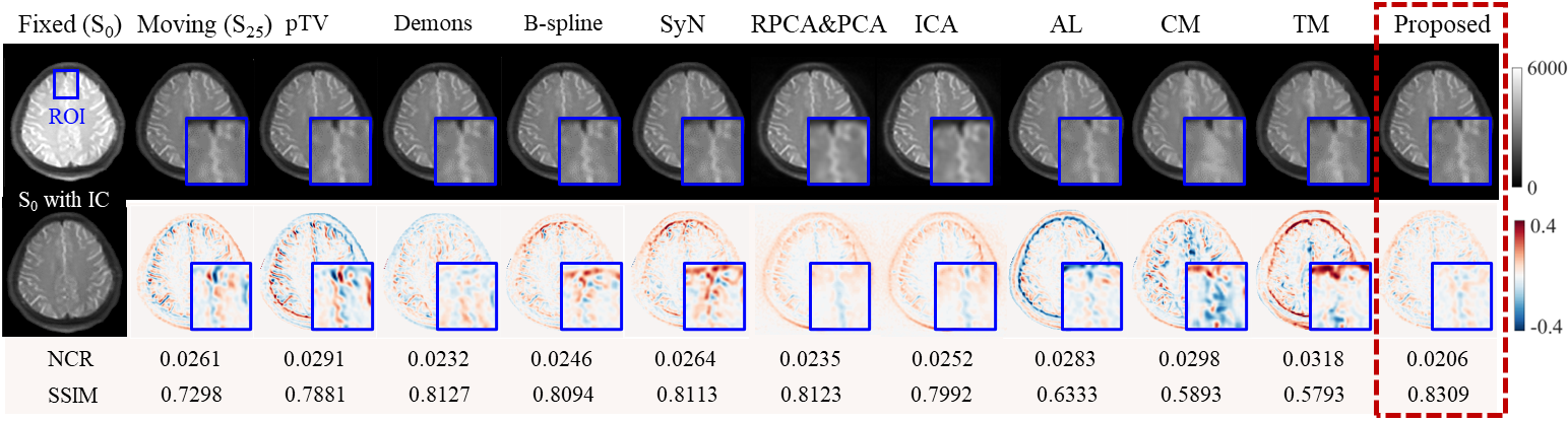 图3:心肌图像在不同方法下的配准残差与结构对比图