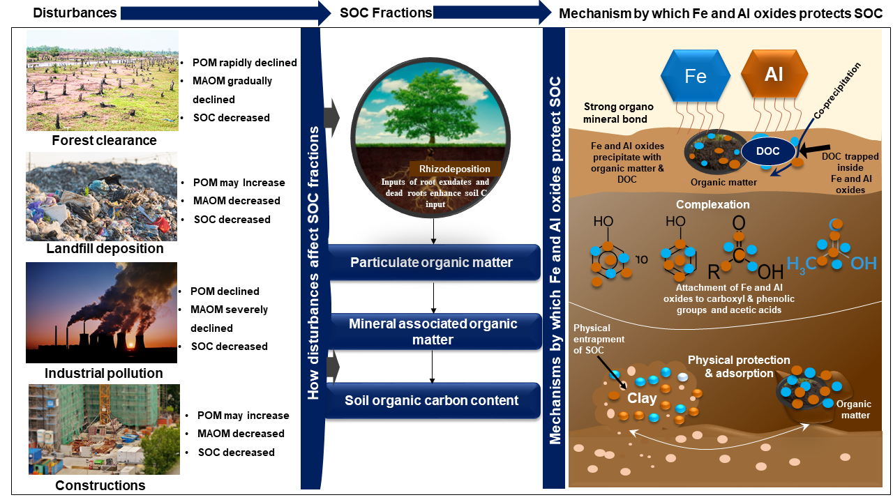 图2. 人为干扰对土壤有机碳组分的影响以及铁铝氧化物稳定有机碳的机制。