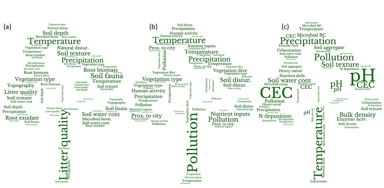 图3. 在城乡梯度上影响土壤有机碳稳定性的关键因素:农村森林(a)、郊区森林(b)和城市森林(c)