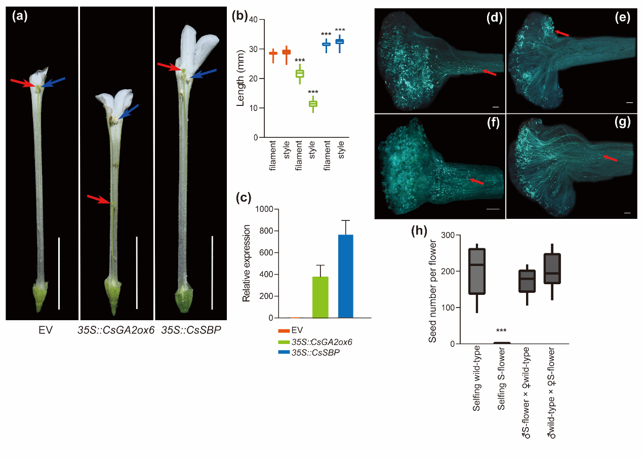 图2. 烟草中过表达CsGA2ox6导致花柱显著缩短和自交不亲和
