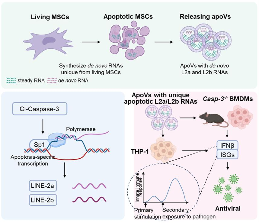 本研究以MSCs为模型,发现MSCs及其apoVs能够从头合成并传递凋亡新生RNA的新现象。凋亡MSCs合成与活细胞不同的特异RNA,包括大量非编码RNA如转座元件RNA、假基因RNA和miscRNAs等。凋亡MSCs特异转录的LINE-2a(L2a)和LINE-2b(L2b)RNAs可传递至 apoVs进一步发挥功能。研究探索了凋亡MSCs新生RNA依赖于Caspase-3/Sp1/RNA聚合酶II合成的新机制。研究还发现携带凋亡特异L2a/L2b RNAs的MSC-apoVs通过调节先天免疫稳态,预防水疱性口炎病毒(VSV)感染的新功能。
