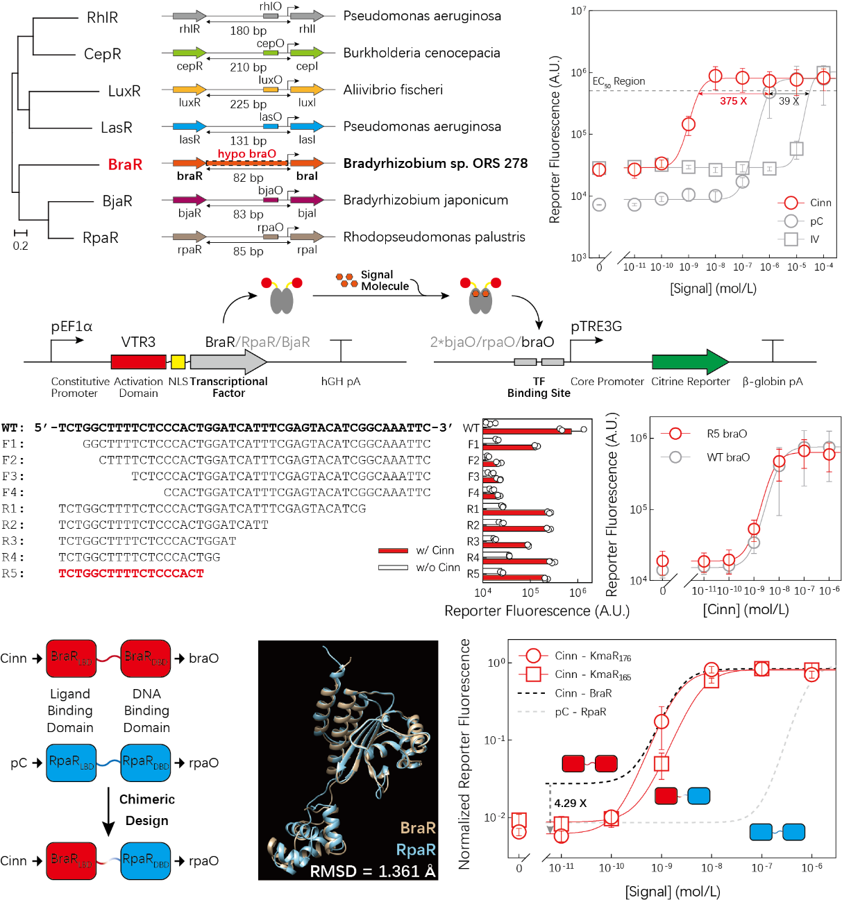 本研究首先构建并优化了Cinn接收模块。实验结果显示,该模块的半最大效应浓度(EC50)低至约10-9 mol/L,其灵敏度比现有报道的最优哺乳动物细胞通讯信号系统提升了约375倍。为了进一步提升性能,研究团队界定了BraR的最小核心结合序列,将其从46 bp精简至18 bp,有效降低了潜在的非特异性结合风险。此外,针对受体本底泄漏较高的问题,团队利用AlphaFold2进行结构预测,采用嵌合工程策略将BraR的配体结合域(LBD)与同源蛋白RpaR的DNA结合域(DBD)融合,成功开发出新型受体KmaR。该受体在保持超高灵敏度的同时显著抑制了本底活性,实现了信号识别精度与动态响应范围的协同优化。