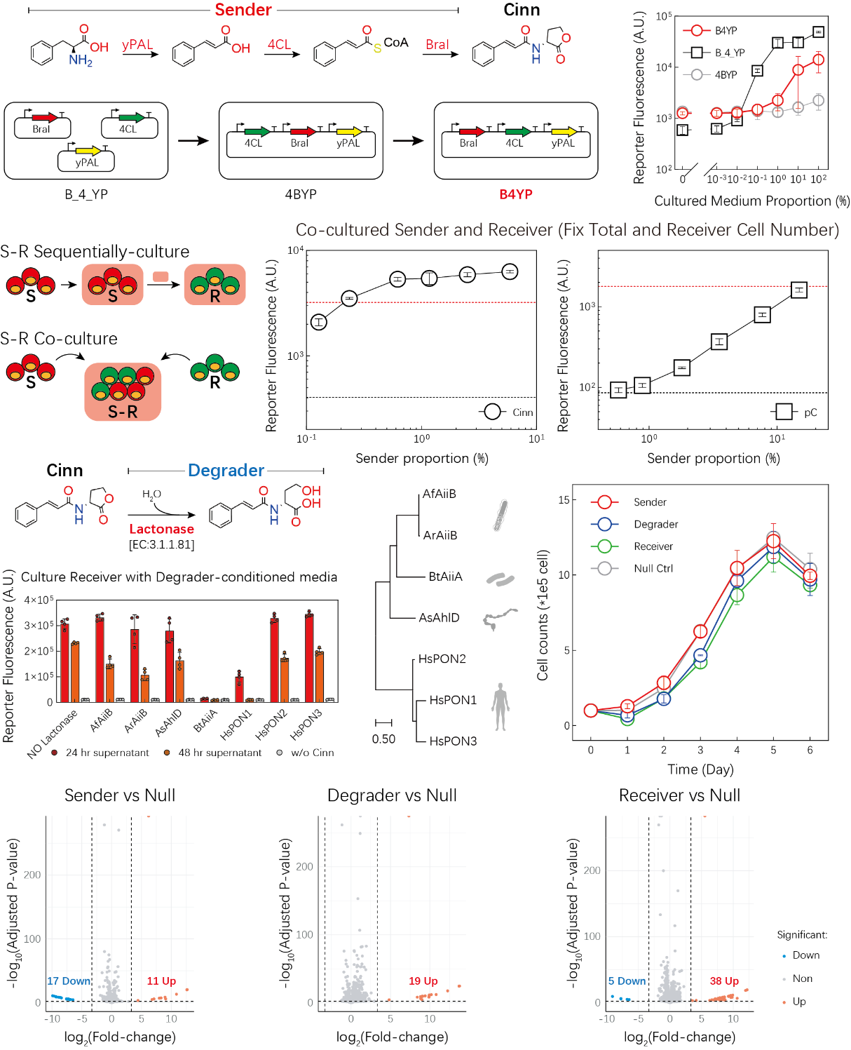 在发送模块方面,本研究设计了包含三种酶的代谢通路,以细胞内广泛存在的苯丙氨酸为底物,实现了无需外源前体(Precursor-free)的Cinn自主从头合成。通过对基因表达盒排布的优化,该模块克服了转录干扰,实现了Cinn分子的稳定高效产出。共培养实验证实,得益于系统的高灵敏度,仅需极低比例的发送细胞即可有效激活接收细胞,建立了稳健的胞间通讯。为调控信号的时空动态,系统引入了高效的内酯酶降解模块,防止信号累积导致的饱和与干扰。此外,基于细胞生长动力学与转录组学的评估表明,搭载各功能模块的工程化细胞与野生型无显著差异,证实了该系统具有卓越的底盘兼容性与低负担特性。