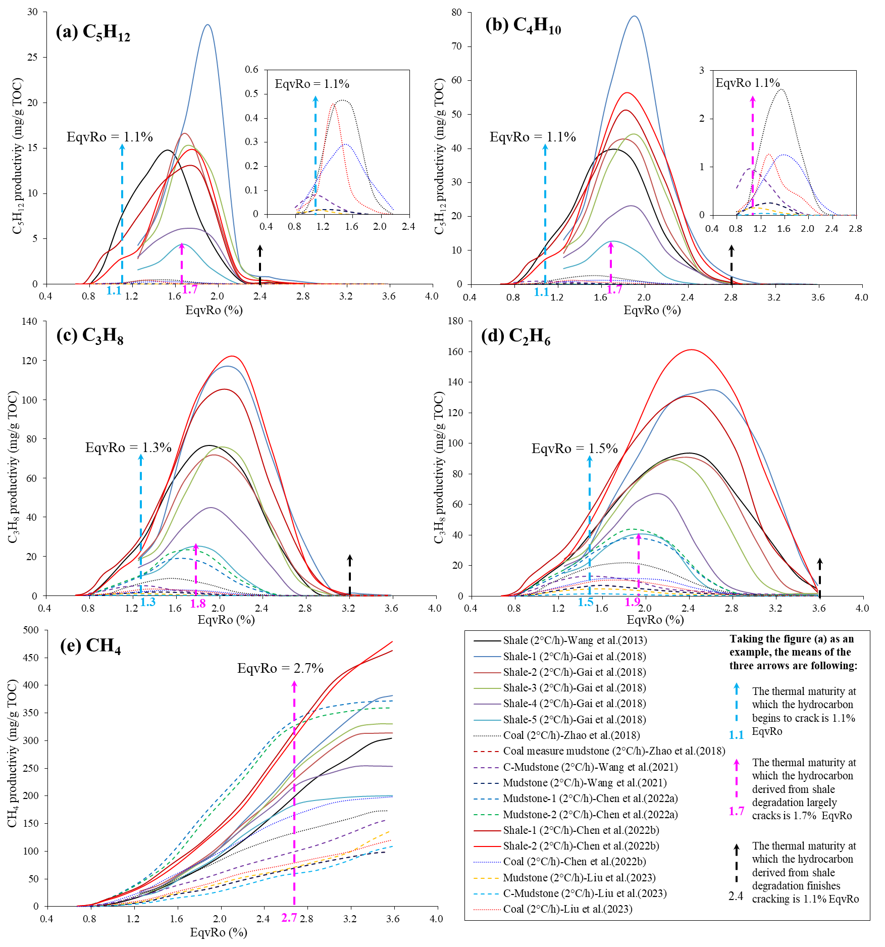 (1)页岩气藏中C5H12、C4H10、C3H8、C2H6和CH4的初始裂解的成熟度(Ro值)分别约为1.1%、1.1%、1.3%、1.5%和2.0%,主裂解阶段分别对应的成熟度(Ro值)区间约为1.7–2.4%、1.7–2.8%、1.8–3.2%、1.8–3.6%和3.0–4.0% (图1);