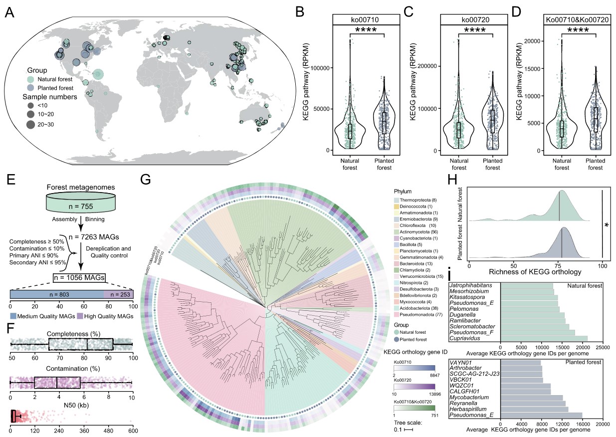 图1. 全球森林土壤微生物固碳地理格局与宏基因组学解析