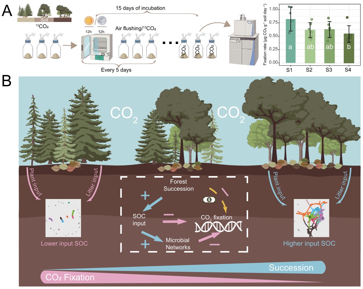 森林生态系统是陆地碳汇的重要组成部分,其土壤碳积累过程在缓解气候变化中具有关键作用。除了分解有机质分解外,土壤微生物还能通过固定大气二氧化碳直接参与土壤碳输入,但对森林演替中该过程的演变规律仍缺乏系统性认识。探究微生物固碳功能如何随森林演替变化,对准确评估森林碳汇潜力具有重要意义。