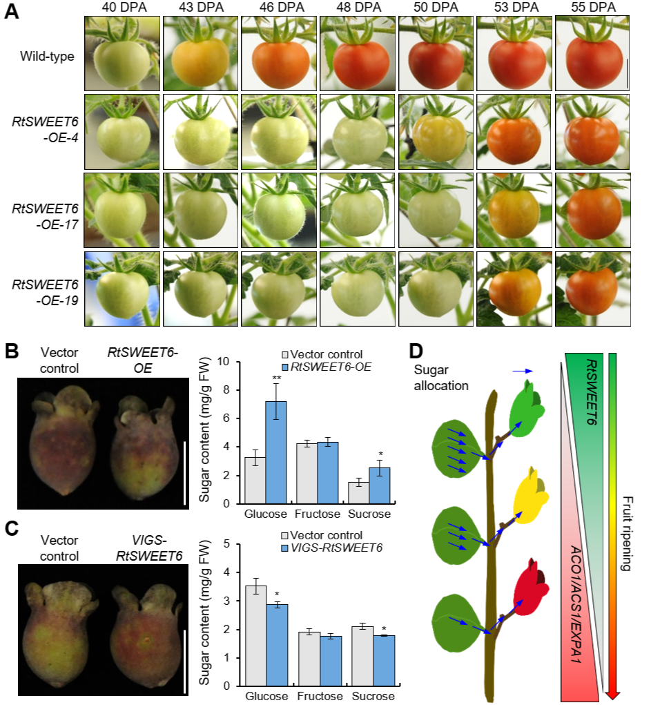 SWEET是一类糖转运蛋白,调控植物体内糖分的韧皮部装载、长距离运输、源-库分配等过程。基于基因组和转录组数据,研究人员鉴定了桃金娘SWEET基因(RtSWEET)家族,并从中发现了RtSWEET6是一个在桃金娘青果期高表达的己糖转运蛋白。异源表达RtSWEET6后,番茄的开花时间提前、成熟过程放缓、葡萄糖和蔗糖的积累增强。在桃金娘浆果中,RtSWEET6也会促进果实糖分积累并通过改变成熟相关基因的表达以抑制果实成熟。本研究证明RtSWEET6调控碳水化合物的源-库分配和果实成熟,揭示了碳水化合物代谢与果实发育之间的新联系。RtSWEET6的双重功能也有助于桃金娘品质改良中的“高糖”和“耐储”两个目标实现精准突破。