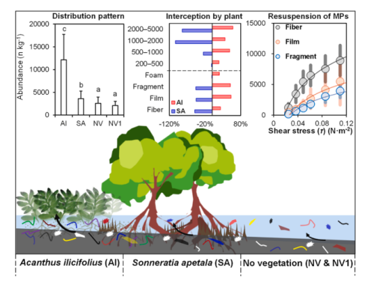 中国科学院华南植物园全球变化生态学研究团队近期在Journal of Hazardous Materials上发表最新研究成果,提供了红树林生态系统微塑料(Microplastics,MPs)源-汇动态的新视角。结合野外样地观测和室内再悬浮模拟试验,研究发现红树植物组织可通过物理拦截作用促进MPs沉积,但是极端天气(台风)引发的剧烈水力扰动会导致沉积物MPs再悬浮(临界切应力约为0.024 N/m2),致使红树林转变为“二次”污染源。本研究为红树林中微塑料的“源-汇”动态提供了量化证据,有望加深对潮间带生态系统中微塑料环境行为的全面理解。