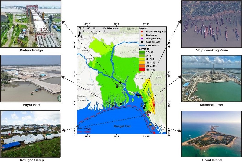 孟加拉湾地处印度洋“一带一路”关键海上节点,其沿岸的孟加拉国位于恒河 — 布拉马普特拉河 — 梅格纳河三角洲,拥有全球最丰富的沉积物输入与高度密集的沿海人口。该区域气候受南亚季风强烈控制,海洋环境在自然波动与人类干扰的共同作用下极为复杂。近年来,随着快速的城市化、工业化以及港口、桥梁、拆船业等大型基础设施建设,孟加拉湾已成为全球关注的海岸带环境热点区之一,同时其独特的地缘位置使其在区域经济发展、海洋资源利用和生态安全方面具有战略意义。