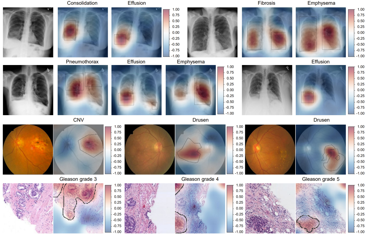 研究人员介绍,“我们让AFLoc 模型同时学习两类信息,一类是医学影像本身,比如胸片、眼底照片或病理切片,另一类是医生撰写的临床报告。通过反复‘对照学习’,AFLoc模型会逐渐明白:临床报告中提到的疾病描述,对应影像中的哪些区域。久而久之,即使没有人工标注,它也能在影像中准确标出最可能的病灶位置。”