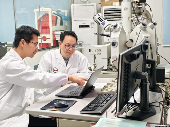 图2:在电子探针实验室,薛硕副研究员(左)与杨武斌研究员(右)一同进行实验样品的微区成分分析,以获取关键的地球化学数据
