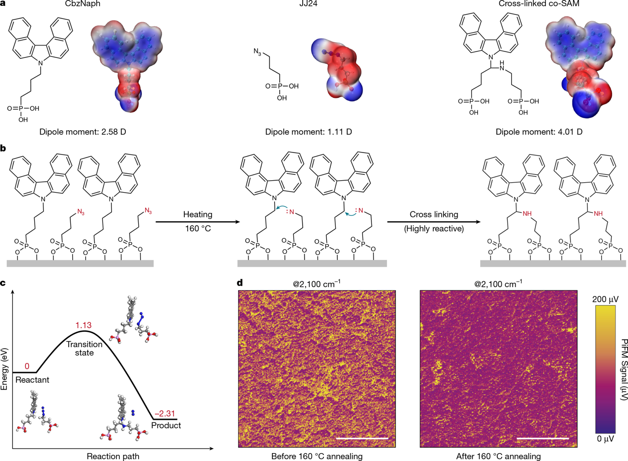 9月17日,中国科学院深圳先进技术研究院先进材料科学与工程研究所光子信息与能源材料研究中心杨春雷研究员和张杰副研究员团队,联合香港岭南大学、吉林大学、香港城市大学的研究团队,合作在Nature上发表最新研究成果。空穴选择性自组装单分子层(SAM)在推动反式钙钛矿太阳能电池认证光电转换效率(PCE)达到27%以上发挥了关键作用。然而,它们的不稳定性往往会损害器件的运行性能,严重阻碍其实际应用。针对这一挑战,9月17日,中国科学院深圳先进技术研究院先进材料科学与工程研究所光子信息与能源材料研究中心杨春雷研究员和张杰副研究员团队,联合香港岭南大学、吉林大学、香港城市大学的研究团队,合作在Nature上发表最新研究成果。合作团队开发出了一种普适性的SAM分子原位交联构象强化策略,解决了SAM在高效率钙钛矿基光伏技术中的稳定性难题,对促进反式钙钛矿光伏技术和下一代钙钛矿基叠层光伏技术的商业化应用具有重要意义。该研究中,研究团队设计引入了一种优化了碳链长度的含叠氮基团新型SAM分子JJ24,能够增强主体SAM分子CbzNaph在透明导电氧化物衬底表面的分布均一性,并抑制自组装过程中缺陷和空隙的形成。JJ24分子的含叠氮基团可以通过热激活方式,与CbzNaph分子的烷基链原位共价交联,构成紧密组装的co-SAM层(图1)。这一结构显著增强了CbzNaph的择优取向性(图2),并通过强化CbzNaph分子烷基链连接体刚性,抑制在光照和热应力下因分子摆动而引起的透明导电氧化物衬底表面暴露,防止了钙钛矿层埋底界面分解,并抑制器件界面处的非辐射复合损失(图3)。基于该方法制备的反式钙钛矿太阳能电池同时实现了26.9%的认证效率,且连续工作1,000小时后,效率零衰减(基于ISOS-L-2测试标准),并在–40°C至85°C之间经过700次重复热循环后,仍能保持>98%的初始PCE,代表了该领域的顶尖水平(图4)。该研究提出了一种普适性的SAM分子原位交联构象强化策略,改善了SAM分子的衬底覆盖度和构象稳定性,解决了高效率反式钙钛矿太阳能电池埋底界面退化引发的工况稳定性难题,同时也为其他采用高粗糙度基底的高效率SAM基器件的工况稳定性提供了解决方案,对钙钛矿基光伏技术在光伏电站、光伏建筑一体化、新能源汽车光伏充电、低空飞行器光伏动力能源和分布式光伏等方面的商业化应用具有重要意义。香港城市大学姜文林博士和曲歌平博士为共同第一作者。通讯作者为香港城市大学任广禹教授、中国科学院深圳先进技术研究院张杰副研究员、吉林大学蒋青教授、香港岭南大学吴圣钒教授。在中国科学院深圳先进技术研究院的研究工作得到了国家自然科学基金的资助。<!--!doctype-->文章上线截图,原文链接:https://doi.org/10.1038/s41586-025-09509-7图1. CbzNaph和JJ24的分子设计与交联机制,及其PiFM实验验证。图2. CbzNaph分子和JJ24分子的分子动力学模拟。图3. CbzNaph和JJ24分子交联对钙钛矿层埋底界面分解机制的研究。图4. 应用CbzNaph:JJ24交联空穴选择层的反式钙钛矿太阳能电池效率及稳定性测试。