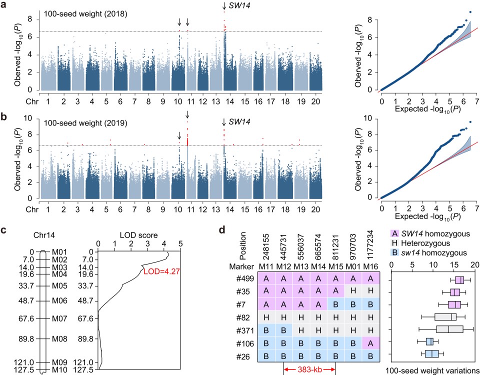 大豆(Glycine max L. Merr.)是全球重要的油料作物和经济作物,也是人类优质蛋白和饲料蛋白的重要来源。尽管大豆原产于中国,但当前我国大豆供需矛盾突出,国内产能无法满足实际需求,约85%的需求依赖进口。因此,提高大豆单产并改善品质已成为当务之急。种子大小和油脂蛋白含量是影响大豆产能的关键农艺性状,鉴定调控大豆种子性状的关键基因并解析其分子机制,对利用分子设计育种技术培育高产优质大豆新品种具有重要的意义。中国科学院华南植物园侯兴亮团队研究通过全基因组关联分析(GWAS)及QTL定位,在14号染色体上鉴定出一个与百粒重显著相关的稳定信号区间,并确定了一个调控大豆百粒重及品质的关键基因SW14。进一步研究发现,SW14与植物种子发育核心调控因子Leafy Cotyledon1(LEC1)在大豆中的同源基因GmLEC1a/b发生互作,抑制了GmLEC1在种子发育过程中介导的转录激活功能。进一步分析显示,优良等位基因SW14H3在大豆驯化过程中经历了人工选择,并展现出提高大豆产量的应用潜力。研究团队致力于大豆种子发育及环境适应性研究,并取得了一些重要进展(Yu et al., Nature Plants, 2023;Li et al., Molecular Plant, 2024;Lu et al., Nature Genetics, 2017)。该研究进一步揭示了大豆种子粒重与品质形成的分子调控机制。张春雨副研究员近年来聚焦NF-Y类转录因子在植物生长发育中的功能研究(Zhang et al., JIPB, 2021;Zhang et al., Plant Cell, 2023;Yao et al., Plant Journal, 2025),其研究方向已从模式植物拟南芥逐步拓展至重要农作物大豆。相关研究成果以“Natural allelic variation in SW14 determines seed weight and quality in soybean”为题近日在线发表在Nature Communications(《自然—通讯》)上。中国科学院华南植物园副研究员张春雨、已毕业硕士生李尉郡和博士后谭翠容共同担任第一作者,侯兴亮研究员与张春雨副研究员为共同通讯作者。该研究得到了国家重点研发计划、国家自然科学基金和广东省自然科学基金等项目的资助。论文链接:https://doi.org/10.1038/s41467-025-63582-0图. 大豆SW14的定位及克隆