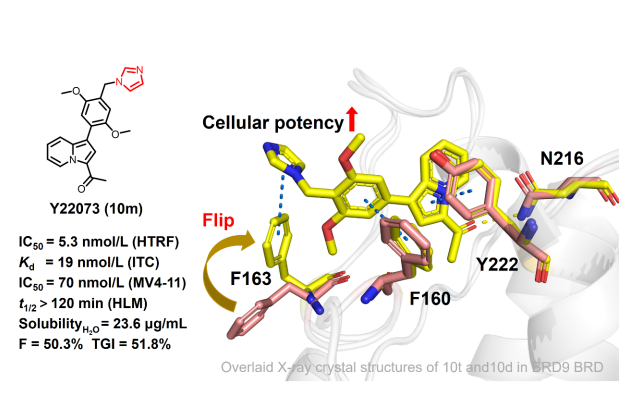 近日,中国科学院广州生物医药与健康研究院许永团队针对溴结构域家族蛋白抑制剂选择性难题,报道了一种在急性髓系白血病(AML)治疗中具有显著疗效的BRD9选择性抑制剂Y22073(专利申请号:2025100176011.1),为AML 精准治疗提供了全新解决方案。近日,中国科学院广州生物医药与健康研究院许永团队针对溴结构域家族蛋白抑制剂选择性难题,报道了一种在急性髓系白血病(AML)治疗中具有显著疗效的BRD9选择性抑制剂Y22073(专利申请号:2025100176011.1),为AML 精准治疗提供了全新解决方案。相关成果以“Key imidazolyl groups that induce phenylalanine flipping enhance the efficacy of oral BRD9 inhibitors for AML treatment”为题发表于药物化学领域Top期刊Acta Pharmaceutica Sinica B上。许永团队长期致力于创新药物靶点发现、作用机制解析及创新药物研究,特别是在肿瘤表观遗传治疗领域获得了系统性的研究成果(J Med Chem, 2022,65,5760;Bioorg Chem, 2024,142,106950;J Med Chem, 2024,67,6952;J Med Chem,2024,67,21577)。溴结构域蛋白9(BRD9)是哺乳动物SWI/SNF染色质重塑复合物家族中ncBAF的核心组分,该组分是目前癌症中频发突变的表观遗传调控复合物。BRD9通过特异性识别组蛋白上的乙酰化赖氨酸,招募转录复合物并介导下游转录调控与靶基因的表达。BRD9在AML等多种癌症中发挥关键表观遗传调控功能,已成为抗肿瘤药物研发的新兴靶点。然而现有BRD9抑制剂在AML治疗中始终未展现显著的体内外疗效,这严重制约其临床转化潜力。针对溴结构域家族蛋白结构高度相似导致的抑制剂选择性难题,团队通过优势骨架化合物库筛选、晶体结构解析以及基于结构的药物设计,成功开发出可用于AML治疗的新型BRD9选择性溴结构域抑制剂Y22073。研究人员从基于结构活性关系(SAR)的优化策略中发现了咪唑类化合物具有卓越的体外抗增殖活性。合作团队通过X射线晶体结构解析(分辨率最高达1.78 Å)精准捕捉到BRD9的ZA通道存在一个独特的“可调控开关”——Phe163翻转开关。抑制剂中关键的咪唑药效基团能够诱导BRD9蛋白的Phe163残基翻转并与其形成稳定的π-π相互作用。然而,其他溴结构域(如BRD7、BRD4、CECR2)中对应位置的残基无法与咪唑基形成有效相互作用,直接证明了该机制的特异性。这一分子层面的突破性发现不仅显著提升了化合物的体外活性,也使得Y22073成为首个在AML模型中展现明确疾病表型干预能力的BRD9抑制剂。研究团队还创新性地采用该修饰策略对现有BRD9抑制剂进行结构改造,结果表明,经此策略修饰后的化合物在体外的活性显著提升,进一步证实咪唑基团可通过调控独特的Phe163开关,在提高活性方面发挥关键作用。Y22073表现出良好的溴结构域选择性、代谢稳定性、溶解性并兼具理想的药代动力学特性,在MV4-11异种移植小鼠模型中表现出显著的口服抗肿瘤效果,且无明显毒性。综合其优异的体外活性、体内疗效及成药性特征,Y22073作为具有First-in-Class潜力的BRD9溴结构域选择性抑制剂,为急性髓系白血病的靶向治疗提供了极具临床转化价值的新型候选药物。许永课题组博士生陈智铭、助理研究员张成和沈慧为本论文的共同第一作者,许永研究员、吴锡山副研究员和张岩副研究员为通讯作者。该项目得到了国家重点研发计划、国家自然科学基金面上项目、广东省“一带一路”联合实验室基金、中国科学院自主部署项目、中国科学院青促会项目和广东省科技厅项目的支持。论文链接 BRD9抑制剂Y22073可作为候选化合物用于AML治疗