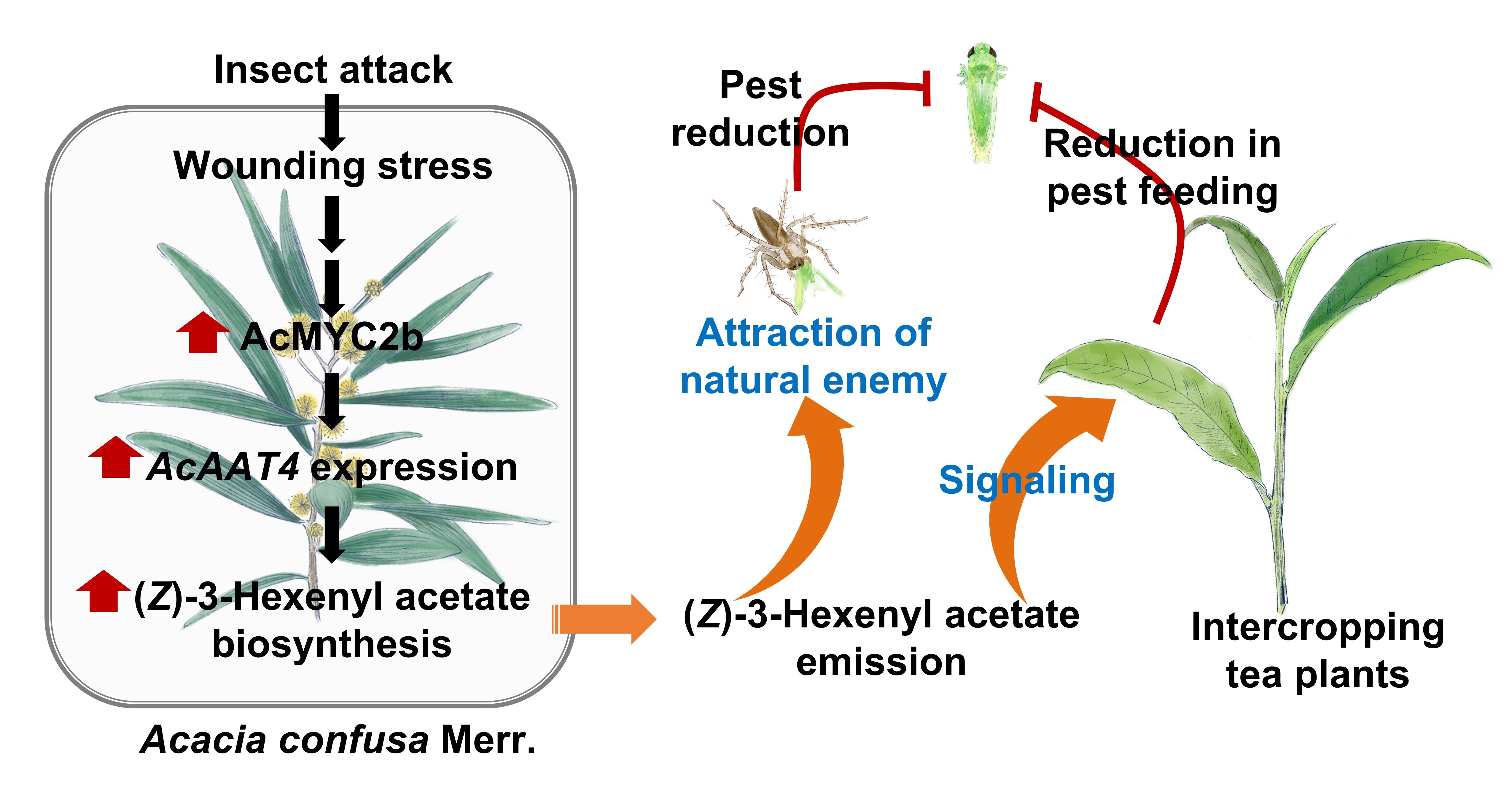 茶树(Camellia sinensis)是重要的经济作物,单一种植模式易导致茶园生态系统脆弱、虫害频发,制约茶产业的可持续发展。近年来,茶树与伴生植物的间作模式逐渐受到关注,其中与台湾相思(Acacia confusa Merr.)的间作在生态调控方面表现良好,不仅显著提升了害虫天敌的数量,还改善了茶叶的品质。中国科学院华南植物园科研团队系统解析了茶园常用间作乔木——台湾相思所释放的主要挥发性物质,明确了(Z)-3-己烯乙酯在调控茶园节肢动物行为中的关键作用。通过茶园实验与室内选择性评价,发现(Z)-3-己烯乙酯具有驱避害虫茶小绿叶蝉及吸引捕食性天敌蜘蛛的双重作用。进一步结合转录水平分析、体内外功能验证及转录调控等手段,明确AcAAT4为催化(Z)-3-己烯乙酯合成的关键酶,且该基因的表达受转录因子AcMYC2b的正向调控(图1)。该成果不仅揭示了台湾相思间作在茶园生态调控中的物质基础及其生物合成机制,也为景观生态茶园建设体系的完善与茶树优质高效栽培技术的提升提供了理论依据。相关研究结果以题为“Mechanism mediating the biosynthesis of the anti-insect volatile (Z)-3-hexenyl acetate in Acacia confusa Merr.,an intercropping plant in tea plantations”近日在线发表在Molecular Horticulture(《分子园艺》)上。中国科学院华南植物园已毕业的简国泰博士和广东省农业科学院茶叶研究所黎健龙研究员为论文的共同第一作者,中国科学院华南植物园曾兰亭研究员为论文通讯作者。该研究得到广东省杰出青年基金等项目的资助。论文链接:https://molhort.biomedcentral.com/articles/10.1186/s43897-025-00165-z图1. 台湾相思防御代谢物(Z)-3-己烯乙酯的抗虫功能与形成机制