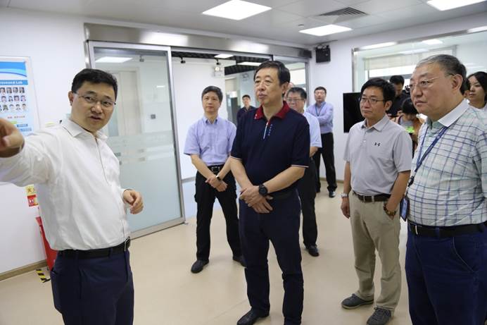 何岩听取深圳先进院在体制机制创新、人才队伍建设、研究生教育、科研与产业化成果等领域的进展后,实地调研了磁共振、超声大仪器、先进电子材料等实验室,深入了解合成生物所与脑科学研究所平台建设情况,并参观了中科创客学院。