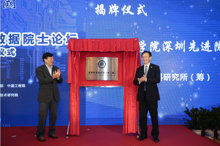 中国工程院院士干勇(左)、深圳先进院院长樊建平(右)为中科院深圳先进院先进电子材料研究所(筹)成立揭牌