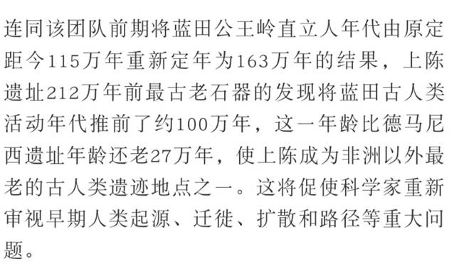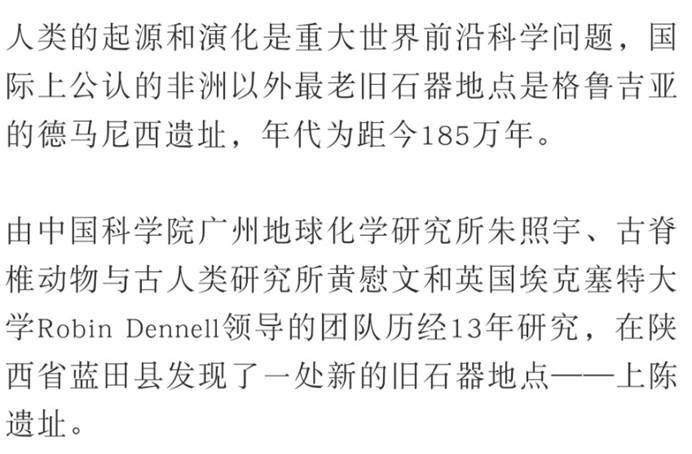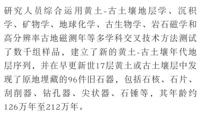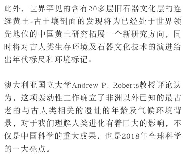 2月27日,科技部基础研究管理中心召开“2018年度中国科学十大进展专家解读会”,发布2018年度中国科学十大进展。由中国科学院广州地球化学研究所朱照宇、中国科学院古脊椎动物与古人类研究所黄慰文和英国埃克塞特大学Robin Dennell等组成的研究团队所取得的“将人类生活在黄土高原的历史推前至距今212万年”进展入选。