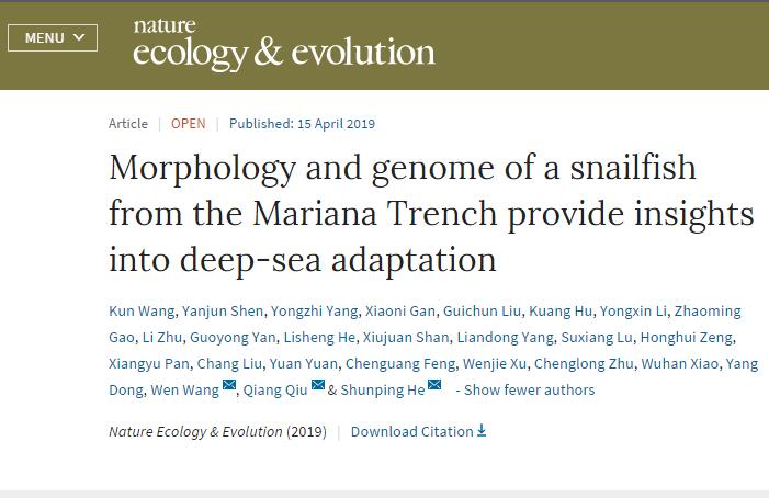 中国科学院深海科学与工程研究所和水生生物研究所与西北工业大学联合攻关,对生活在马里亚纳海沟7000米以下的狮子鱼开展了多方面的深入研究,在分类学上厘清了其系统地位,首次在形态上发现其适应深渊的变化,在多组学大数据分析的基础上揭示了深渊适应的遗传基础。北京时间4月15日23时许,该研究成果在线发表于英国自然杂志子刊Nature Ecology & Evolution(自然-生态与进化),题为《Morphology and genome of a snailfish from the Mariana Trench provide insights into deep-sea adaptation》。深海所为第一作者单位和第一通讯作者单位。