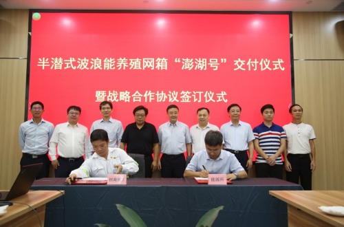 6月30日,半潜式波浪能养殖网箱“澎湖号”交付暨战略合作协议签订仪式在招商工业集团孖洲岛海洋高端装备造修基地举行。招商局工业集团总经理胡贤甫、副总经理吴四川,自然资源部国家海洋技术中心能源室主任王海峰,广东省农业农村厅渔业发展处处长于培松,法国BV船级社海工部(中国区)总经理曲国旗,广东大麟洋海洋生物有限公司董事长蔡春有,中国科学院广州能源研究所所长马隆龙、副所长李小森等40多位领导和渔业公司负责人出席活动。