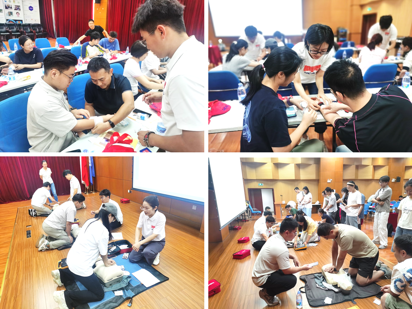 随后,培训导师李龙兴、夏侯一冉及助教导师们为与会学员进行现场授课演示。培训导师详细地介绍了止血包扎、气道梗阻、骨折、溺水、失温、动物叮咬等野外科考常见意外情况的急救技能,并对自动体外除颤仪(AED)的使用方法结合心肺复苏(CPR)具体流程,一对一地指导学员进行实操练习。培训过程中,学员们认真听讲、积极实操。经过培训导师们的悉心指导演练,参与培训的学员全部通过了急救培训笔试及实操考核,获得了国内认可的急救员资格证。