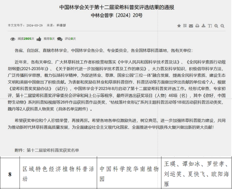4月5日获悉,为表彰和奖励在林业和草原科普创作、科普活动等方面做出突出贡献的单位或个人,根据《梁希科普奖奖励办法》(试行),中国林学会于2023年8月启动了第十二届梁希科普奖评选工作。经形审评审等程序,中国科学院华南植物园“区域特色经济植物科普活动”荣获科普活动类奖,这是华南植物园科普工作在林业科普领域的重大突破。