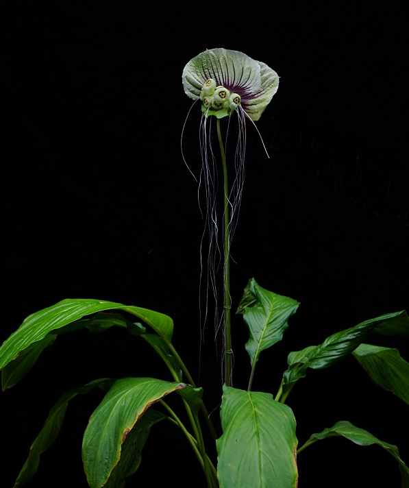 扇苞蒟蒻薯(Tacca subflabellata)是薯蓣科蒟蒻薯属的多年生草本植物,挺直的花葶顶端是它独特的花序:两枚硕大、绿白色的总苞片圆扇状,似扇动的贝壳,又似飞舞的蝶翼,总苞片中央放射状的紫黑色斑纹为其清新的气质增添了一丝神秘,背面还有两枚稍小的绿色外轮总苞片;细长下垂的银色“胡须”则是它的小苞片;真正的花朵是中央挂着的那一串绿白色的“小铃铛”,“小铃铛”花被片6枚,向后反卷,当中6枚酷似小米粒的嫩黄雄蕊。整个花序造型十分独特,似深海中飘动着长长触须的水母,又像身披银发、头戴簪花帽的神秘少女。
