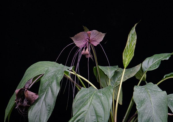 与扇苞蒟蒻薯同属的箭根薯(Tacca chantrieri)也正值花期,它们都有硕大的总苞片和线形小苞片(“胡须”),只不过箭根薯的总苞片、小苞片和花朵都是紫黑色,自带神秘感,整个花序看上去就像一张龇牙咧嘴的老虎脸,细长下垂的小苞片状如虎须,因此箭根薯通常也被叫做老虎须。