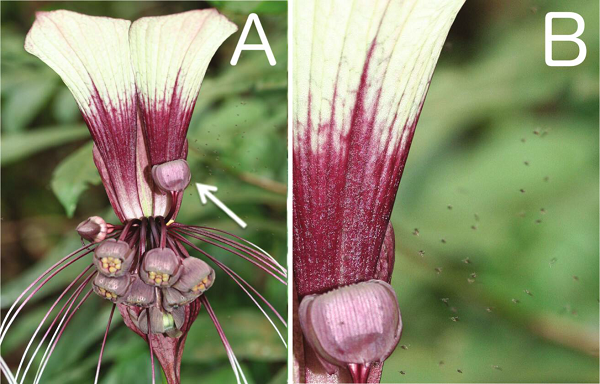 2. 这些花部特征在有些地区仍能有效地吸引传粉者进行异花授粉。例如同样拥有夸张花部特征的Ticca cristata(现已被并入丝须蒟蒻薯)在新加坡的一个种群开花时受到了雌性角足蠓的访问和传粉[2];高度自交的老虎须也受到了无刺蜂的访问[1]。