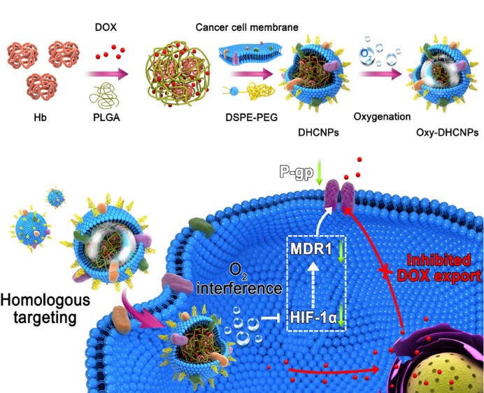 “纳米仿生氧载体”利用癌细胞外层的粘附分子靶向识别同源癌细胞肿瘤,与乳腺癌细胞相互结合与锚定,实现了同源肿瘤的定向给药;同时将化疗药物和血红蛋白负载的氧气递送到肿瘤内部。研究结果表明受益于靶向的氧补给,肿瘤缺氧微环境被改变;从而降低了缺氧诱导因子HIF-1α和P糖蛋白表达;泵出癌细胞外的阿霉素量减少,改善了化疗耐药,实现了安全高效的化疗。采用“以癌治癌”策略有望在个体化化疗与细胞治疗方面获得应用。
