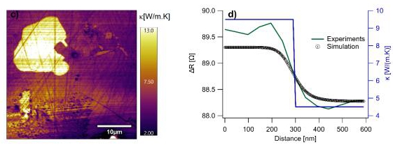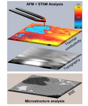 在本项研究中,科研人员运用扫描热成像原子力显微镜(SThM)定量测量三相结构的方钴矿热电材料的局域热导率,通过背散射电子显微镜(BSE)确定材料的微区成分,再通过热探针实现同一局域的热成像(SThM)。以往SThM成像倍受形貌起伏的干扰,但在这一工作中,热成像(SThM)与形貌像(Topography)没有关联,而与成分相(BSE)一一对应,这一发现前所未有。借助于一系列标准样品的标定,结合有限元局域热传导过程模拟,研究人员确定出材料局域的热导率分布,并准确捕捉其在两相界面处的变化。