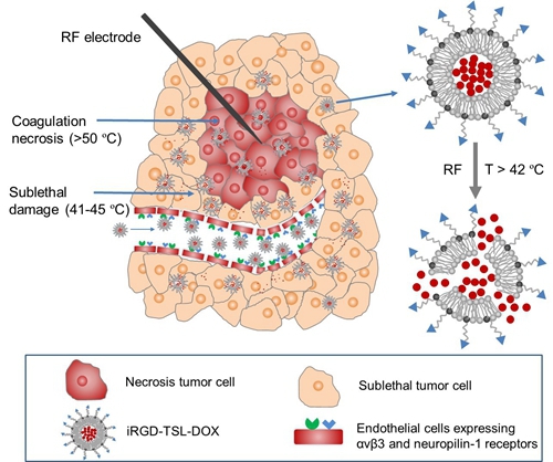 郑海荣、杨薇和严飞等基于超声给药治疗方向前期工作基础(J Control Release 2016;243:333-341;Theranostics 2016;6(13):2337-2351;J Control Release 2016;224:217-228),采用温敏脂质体包载化疗药物(阿霉素),进一步用肿瘤渗透肽进行表面修饰,制备获得了能靶向渗透肝癌组织的靶向载阿霉素温敏脂质体(iRGD-TSL-DOX)。利用靶向渗透肽对载阿霉素温敏脂质体进行表面修饰后,可以在超声引导射频消融之前将载药温敏脂质体富集于肿瘤组织,当对肿瘤进行射频消融治疗时,射频辐照的核心区域肿瘤组织温度较高(> 50°C),可以导致肿瘤细胞的凝固性坏死,而射频辐照的周边区域肿瘤组织温度较低(41-45°C),可以诱导温敏脂质体释放包含内部的药物,由此显著增强了射频消融治疗肿瘤的效果。该研究采用“射频消融联合温控释药”的策略有望进一步提升射频消融在临床应用价值。