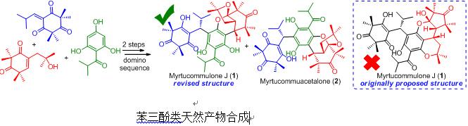 Myrtucommulone J和myrtucommuacetalone都是从桃金娘科植物香桃木(Myrtus communis)中分离到的具有重要生理活性、新颖结构的间苯三酚类天然产物。体外活性评价发现,myrtucommulone J具有显著抗菌活性,它的MIC值低达0.38 μM (0.25 μg/mL);其活性优于临床上最后一道屏障‘万古霉素’4倍,同时对于人体正常细胞具有35倍以上的选择性因子,因而被认为是非常富有应用前景的植物源天然抗生素之一。Myrtucommuacetalone则显示出非常显著的抗肿瘤(T细胞增殖)活性,其IC50值为0.5 μg/mL。它们突出的生物活性以及新颖的结构特征,使得它们成为合成化学、药物化学以及药理学领域广泛关注的靶标分子。