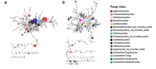 图:真菌群落共存网络的变化。a,降水变化(MAPS)处理下;b,对照(control)处理下。