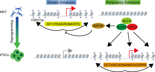 研究发现,在转变过程中,早期成纤维细胞的很多特异性开放位点会被迅速关闭(OC),而到重编程后期很多多能性相关的位点则会被打开(CO)。科研团队认为开关的事件是直接与转录因子活性相关,因此对CO/OC位点的基序(motif)进行深入分析。分析发现,CO位点显著的富集出了重编程因子OCT、SOX、KLF的基序(motif),这与使用的重编程因子Oct4/Sox2/Klf4是吻合的,但CO的过程是非常缓慢的。在更加快速的OC过程中,在OC位点上特异富集出了很强的成纤维细胞特异性的转录因子,例如AP-1,ETS,TEAD,RUNX等家族成员,而没有OCT等重编程因子,证明体细胞相关染色质关闭(OC)过程是OCT、SOX、KLF非依赖的过程。进一步研究发现,与染色质关闭(OC)过程相关的因子都是体细胞重编程的重要障碍。那么,关闭这些位点的OC过程优势如何在操作呢?通过进一步筛选,研究发现,表观修饰基因Sap30在体细胞重编程早期被重编程因子激活,并通过促进成纤维细胞关键基因启动子区去乙酰化修饰,而使其启动子区逐渐关闭,最终沉默成纤维细胞关键调控基因,推动重编程进程。这部分研究结果首次揭示体细胞重编程过程中染色质结构动态变化的规律—CO/OC逻辑,并为理解体细胞重编和其他相关细胞命运转变提供了新的可参考的理论模型。