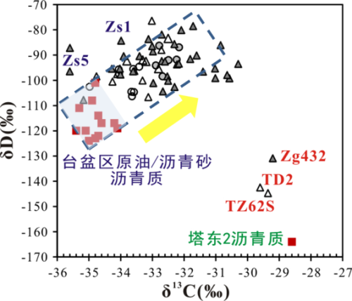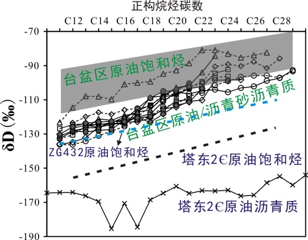 沥青质是原油中分子量最大的有机组分,其分子结构特征与母源干酪根较为接近。通常认为沥青质是原油早期形成阶段的产物,大分子聚合物的特性使得沥青质能够抵抗生物降解、蒸发分馏等次生作用的改造。因此,原油沥青质热解产物的分子碳同位素组成经常用于混合成因油和生物降解油的油-源对比、原油分类和成因研究(Chen et al., 2016)。近期广州地化所贾望鲁副研究员采用热解方法开展了原油沥青质键合态正构烷烃的分子氢同位素组成分析,结合前期积累的原油游离态正构烷烃的碳-氢同位素测定结果(Jia et al., 2013),研究了塔里木盆地深层-超深层海相原油的成因。通过这些工作获得两个主要认识: