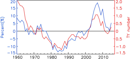 1960-2015期间7-9月登陆中国沿岸台风频数(蓝色)以及登陆台风个数占西北太平洋总台风个数的比例(红色)的7年滑动平均