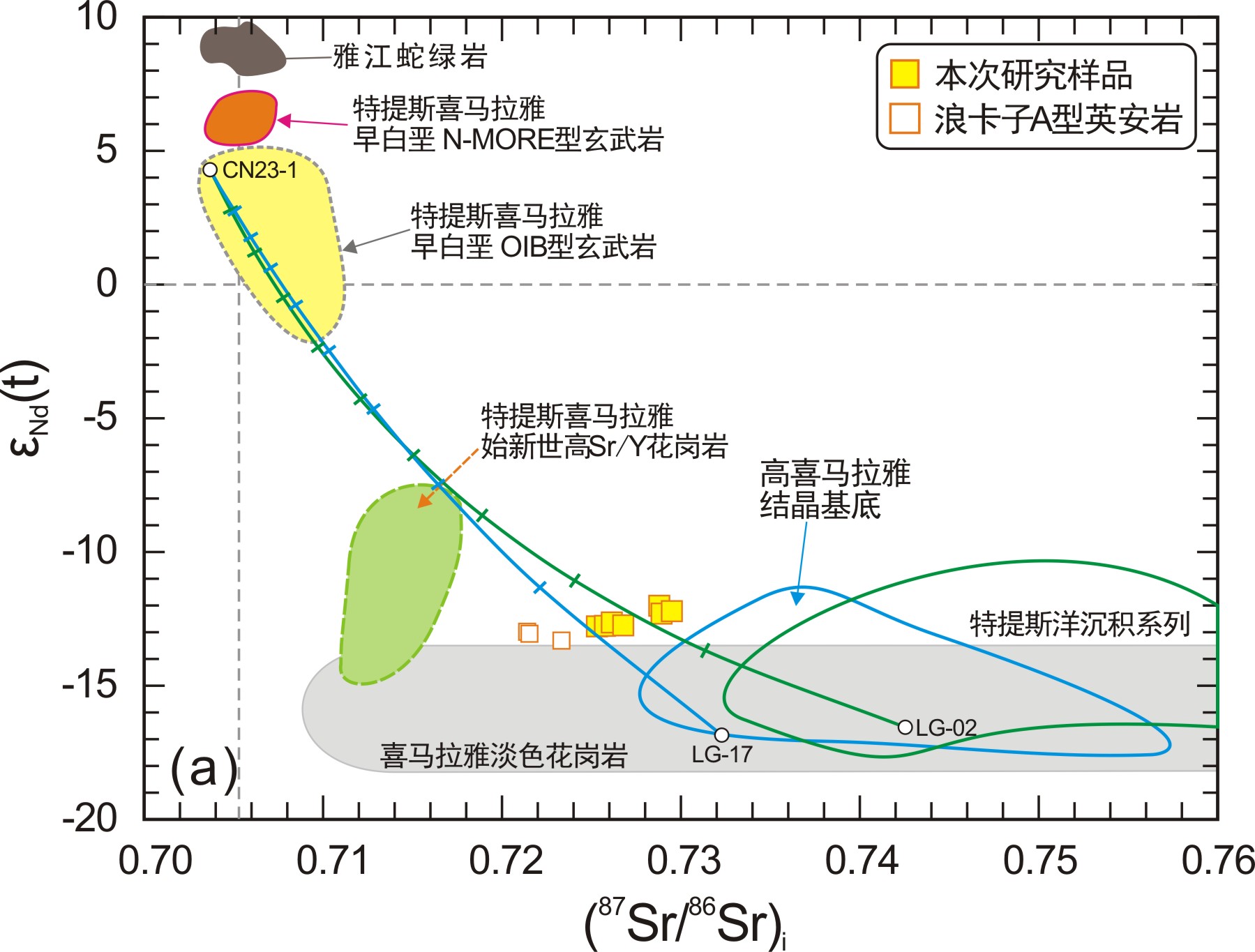 图1 Sr-Nd同位素成分图。指示A型花岗岩的源区为亏损的OIB玄武岩与喜马拉雅变泥质岩混合源区。