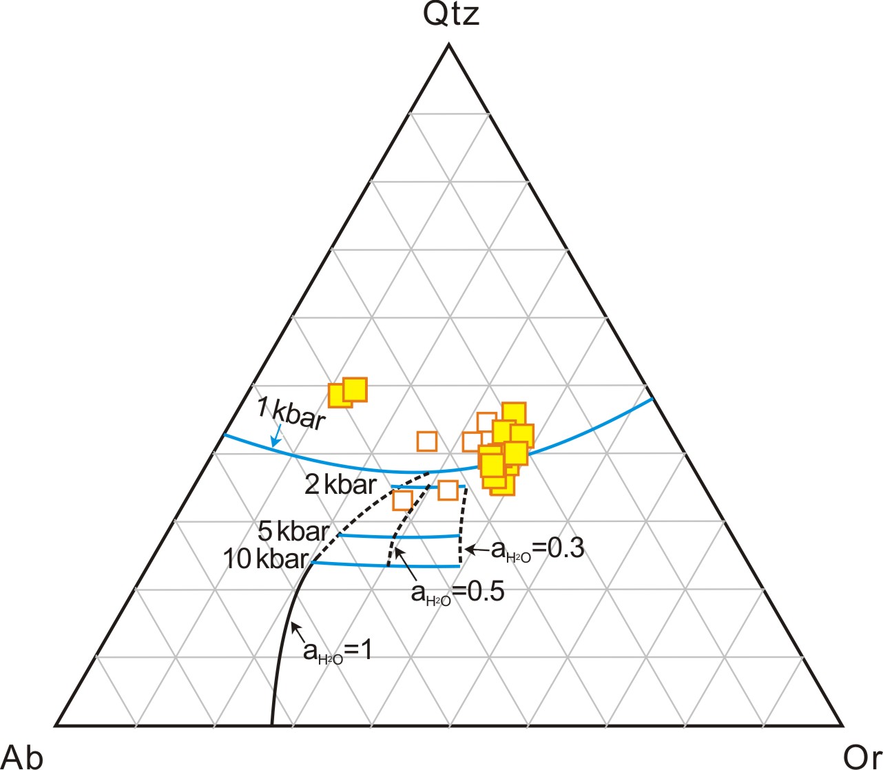 图2 CIPW标准化石英(Qtz)-钠长石(Ab)-钾长石(Or)成分图。该图指示了低压、低水活度的岩浆结晶环境
