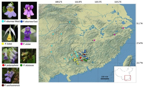 南岭山地复杂的地形和强烈的土壤异质性孕育了高度丰富的植物多样性和特有性。南岭山地是我国生物多样性关键区域之一,具有重要的生物多样性研究和保护价值。但迄今为止,对该地区植物多样性的起源和演化知之甚少。报春苣苔属(Primulina)物种多样性丰富、特有性强,南岭是该属植物的现代分布中心之一。其中,该属牛耳朵(P.eburnea)复合群主要分布于南岭山地,包括了多个南岭特有的物种,为研究南岭植物特有性的起源与演化提供了理想的模式。