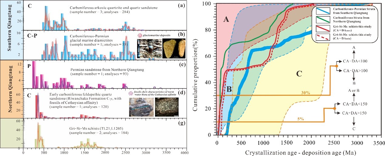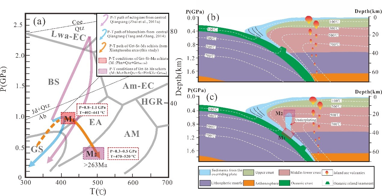 香桃湖地区石榴石十字石云母片岩经历了两期变质作用:(1)早期低温高压变质作用(M1);(2)峰期角闪岩相变质作用(M2)。早期蓝片岩相变质作用(M1)的矿物组合为石榴石变斑晶中多硅白云母(低温高压特征矿物)和石英包裹体,以及与包裹体相邻的富钙的石榴石幔部,其变质条件为P=0.8–1.1 GPa,T=402–441 °C,具有较低的地温梯度(~10°C/km),形成于典型的俯冲带环境。对于其原岩物源分析结果表明,其原岩为俯冲带上盘北羌塘活动大陆边缘沉积,峰期锆石(~350Ma)来自于相邻石炭纪岛弧岩浆岩(图1)。上述结果表明,俯冲带上盘活动大陆边缘可能遭受了显著的俯冲侵蚀作用,导致一部分上盘物质被侵蚀进入俯冲通道,从而经历了早期低温/高压变质作用(M1)。